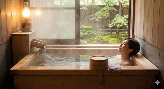 ふたを 開けた 湯ぶねからは、真っ白な 湯気が 上がっています。 その 湯気の 向こうに、鎌倉の 静かな 夜の けしきが 見えます。 「ああ、これが 日本の 人たちが 大好きな 時間なんだな」と、肌で 感じることが できました。
