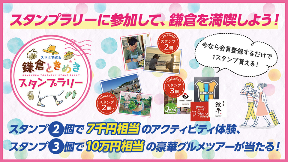 アプリ不要で参加できる!スマホで簡単スタンプラリー!さぁ!鎌倉を満喫しよう! 豪華モニターツアーはお料理セミナーやモデル撮影会、宿泊付きの体験などバリエーション…