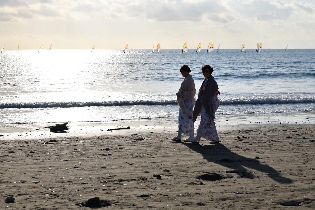 そして人力車は、2人がお泊まりするVacation House 琥珀-AMBER-へ向かいます。行き交う人と俥夫さんとが挨拶を交わしたり、車が道を譲ってくれたり、人力車に乗りながらも、鎌倉の街の人の温かさにも触れることができるのも楽しい。しばらく走ると正面に材木座海岸が。この日はお天気も良くて海がキラキラときれいだったので、俥夫さんにわがままを言って、海岸沿いを走ってもらいました。人力車に乗りながら、海を眺めるなんて贅沢!国内に数店舗あるえびす屋さんの中でも渚を長く走れるコースはここしかないというからこの楽しみ方は鎌倉ならでは。