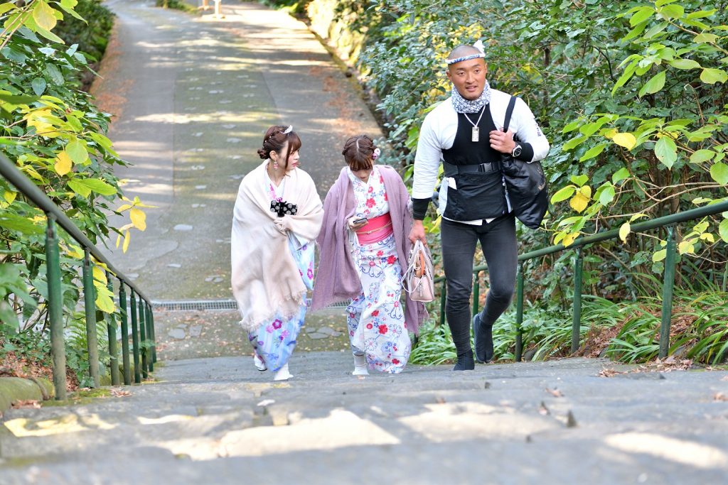 鎌倉駅を降りたら、東口に出て小町通りに向かいます。鶴岡八幡宮に続くこの道は、休日は人もいっぱい。着物レンタルのお店で着物を着付けてもらったら、人力車のえびす屋さんへ。俥夫さんの手を借りてさっそく人力車に乗り込ます。持ち上がった瞬間「怖い!アトラクションみたい」と人力車初体験のもえちゃん。思っていた以上にスピードも速く、2人ともちょっと緊張気味。この日、案内してくれたのは、この道10年目のベテラン俥夫さん。