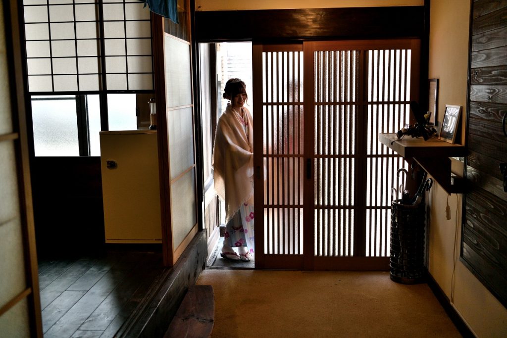 材木座海岸から歩いても2分ほど。外観は築100年の古民家というだけあって、歴史を感じる趣のある一軒家。玄関から引き戸を引いて土間を通って、正面奥に置かれた大きなパンダのフィギュアに迎えられ、2人ともびっくり!天井が高く、お部屋も広くて、インテリアのセンスもおしゃれで和モダンな設え。