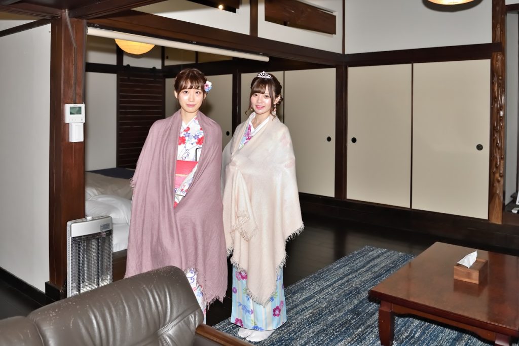 「和な感じが大人っぽくて落ち着く」とまりちゃん。広いバス・ジャグジー、トイレ、キッチン、シャワーなどの水回りはすべて最新の設備だから気持ちよく快適に過ごせます。もえちゃんは「家族と一緒にお泊りしたり、友達何人かでお泊り女子会もいいかも」と、2人とも気に入った様子。