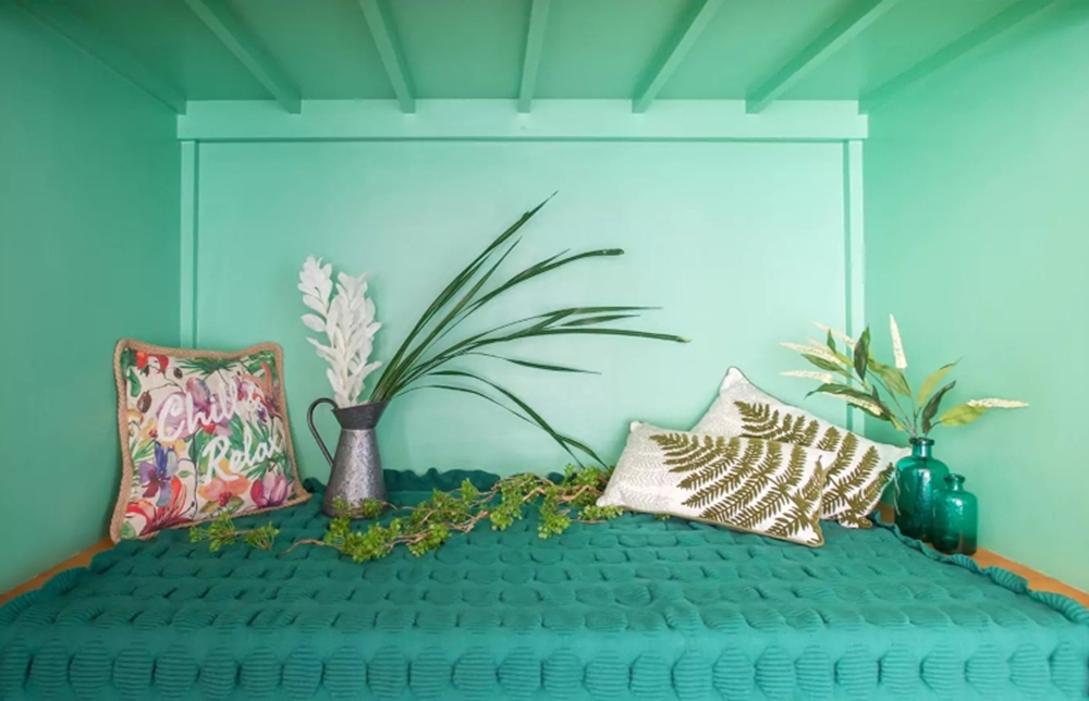 落ち着きあるグリーンを基調とした1室。海岸まで徒歩2分の好立地!